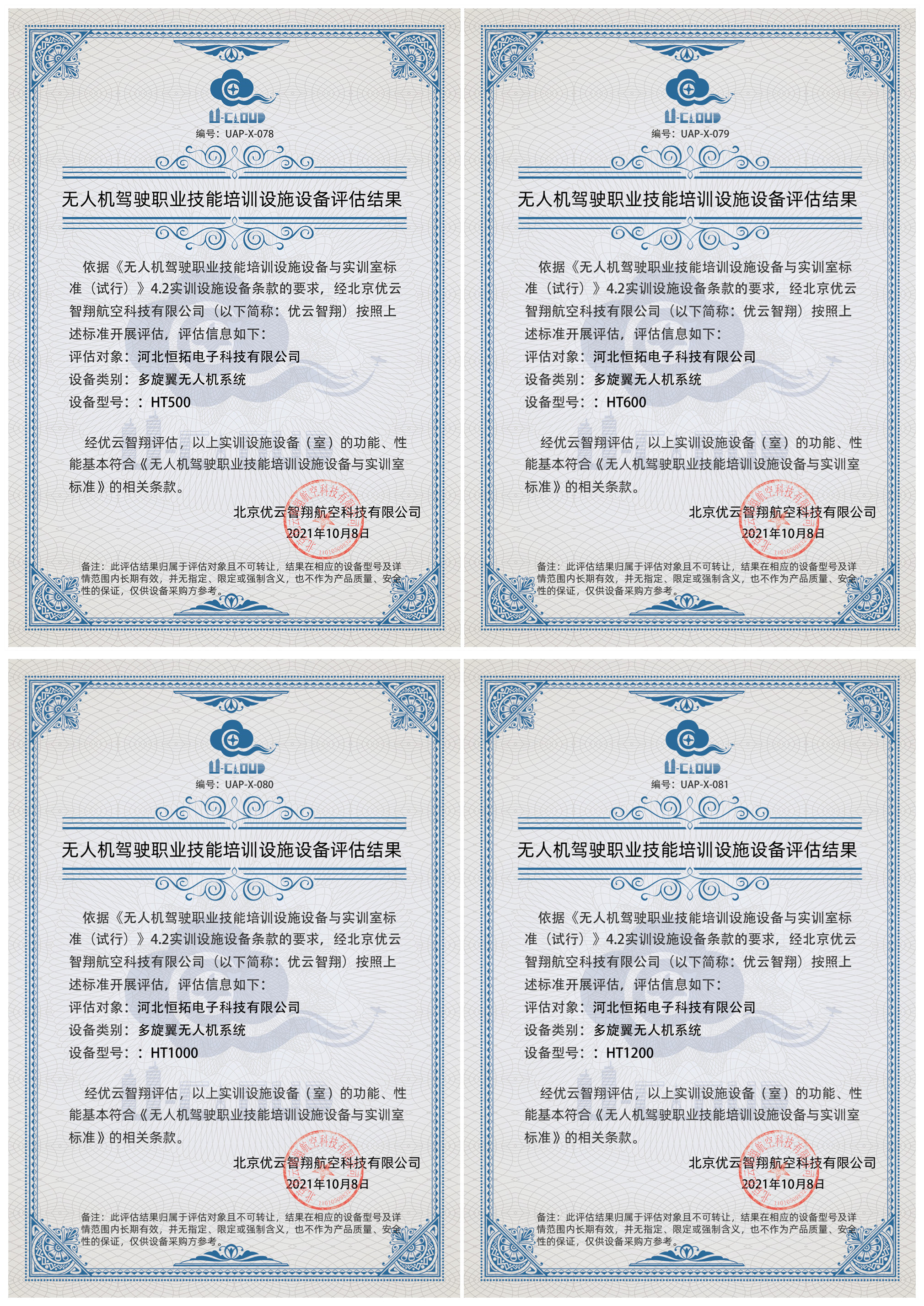 2021年10月,中航恒拓通過了“1+X”無人機駕駛職業(yè)技能培訓設施設備評估,并獲得了多項證書。此系列培訓設備包含HT500四旋翼組裝調試無人機、HT600六旋翼室外實操訓練無人機、HT1000電子執(zhí)照考訓無人機和HT1200行業(yè)應用多載荷無人機共四款機型,可滿足初、中、高級1+X無人機職業(yè)技能等級證書的訓練設備,中航恒拓承諾未來會有更多滿足1+X考試訓練的設備推出。目前,與中航恒拓合作的部分院校已經開始試點1+X證書制度,明年畢業(yè)的部分學生可在畢業(yè)前拿到一張含金量高的技能證書。